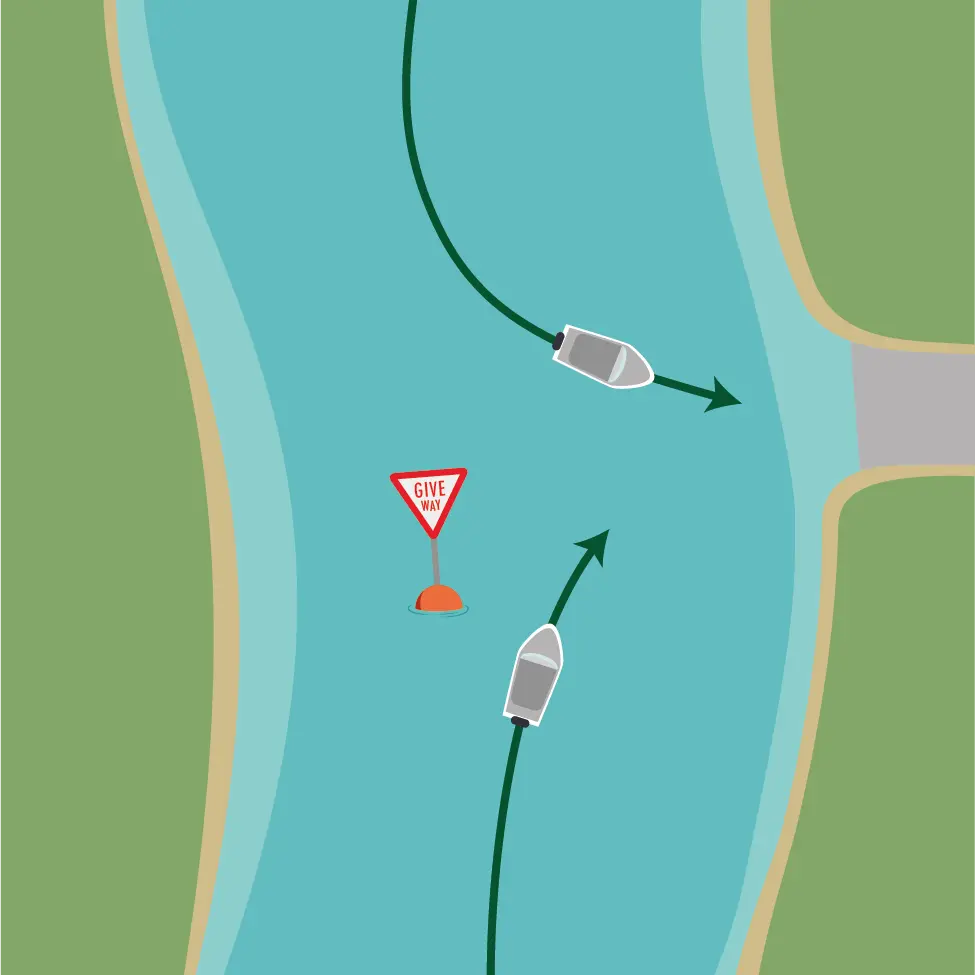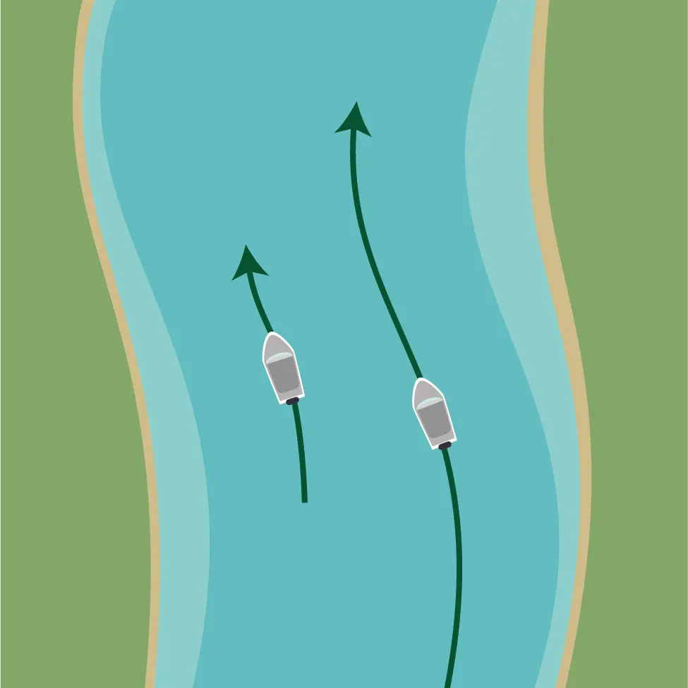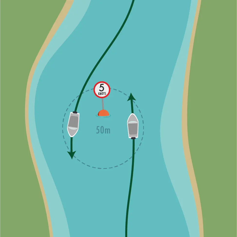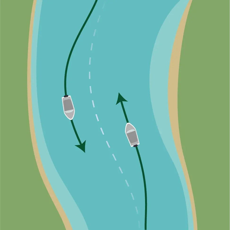 Vessels must keep to the right-hand (starboard) side of the navigable channel whenever it’s safe to do so. Note that in some areas the navigable channel may not sit on the starboard side of the river itself due to shallows or hazards. Always navigate with caution.