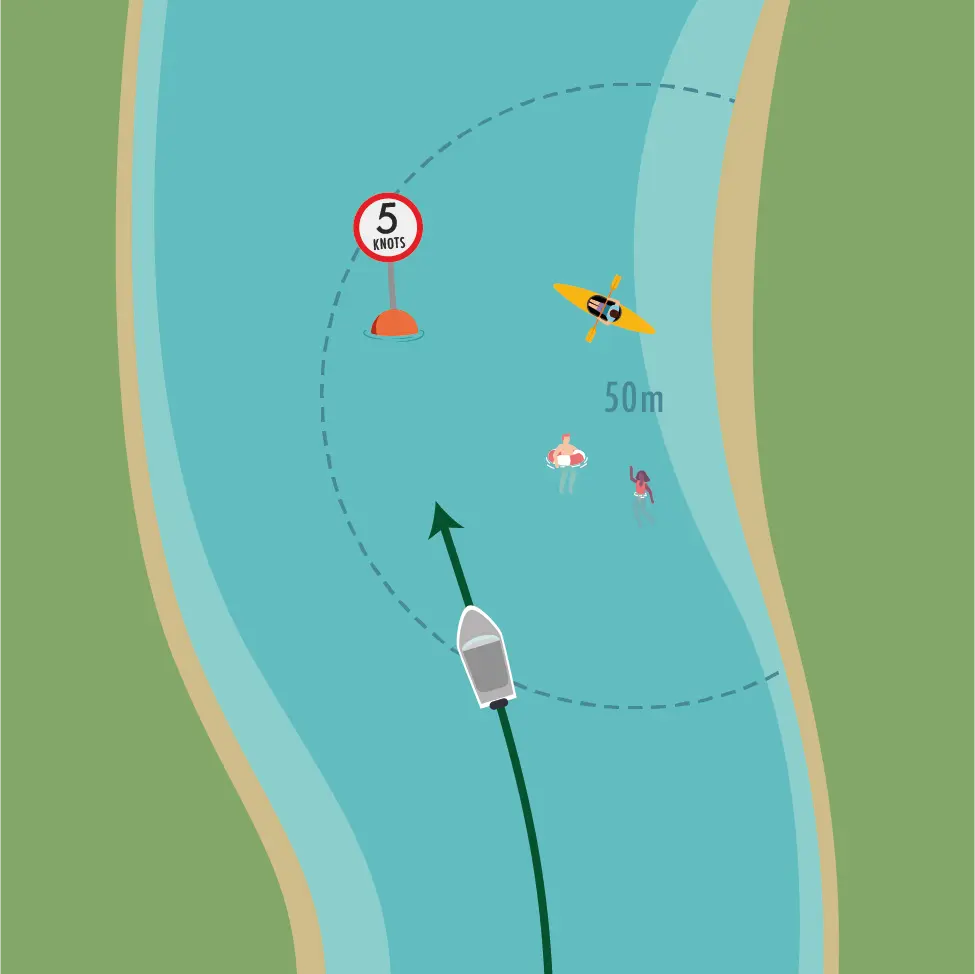 In practice, the most important rule for keeping people safe is reducing speed to 5 knots when within 50m of other vessels, paddlers, swimmers, or anyone in the water – and maintaining 50m distance wherever possible. To make this easy to remember, think of it as the Five Fifty rule (5 knots : 50 metres). When in doubt, slow down.